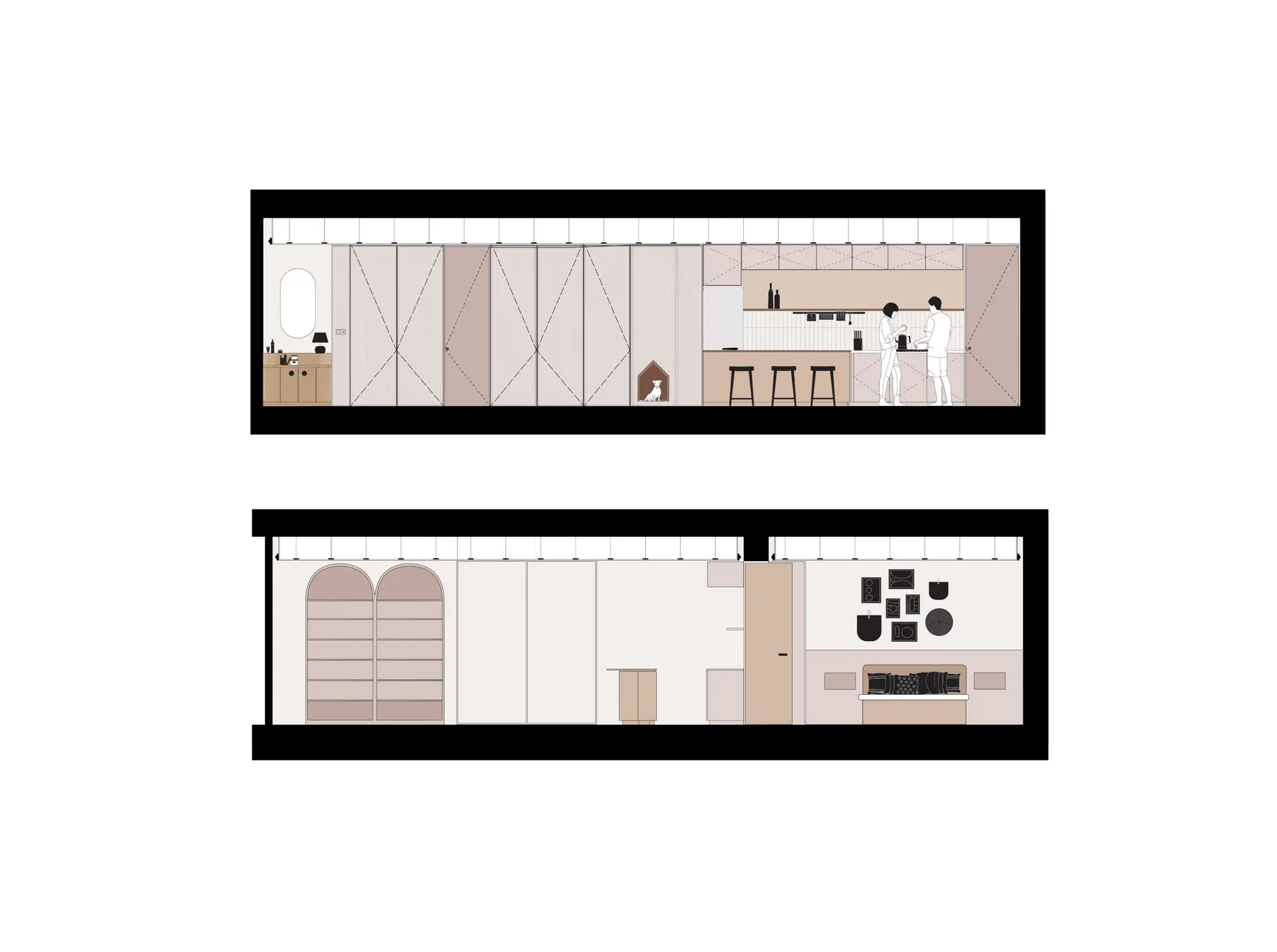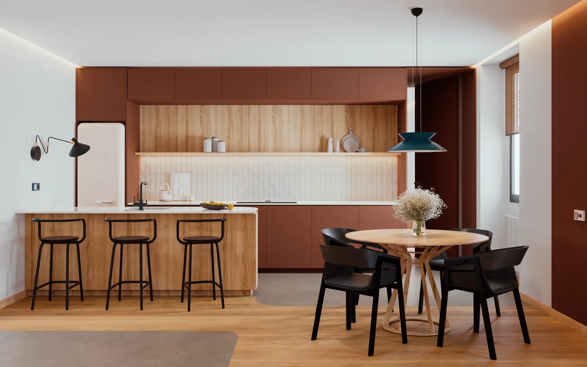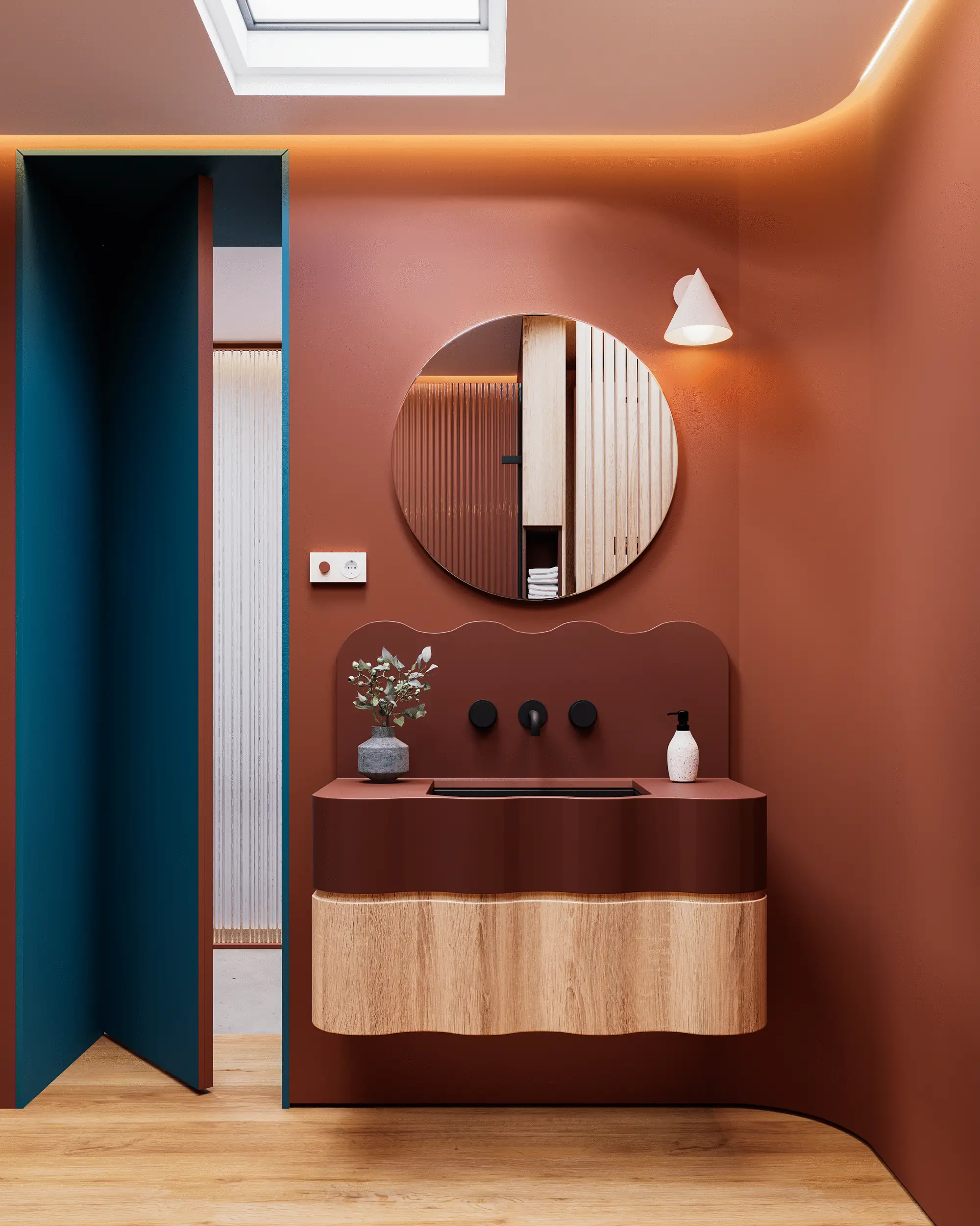 The design stands out for the integration of the couple’s dog, Bau, with personalised spaces created especially for him. Warm materials, such as wood and terracotta tones, create a cosy and contemporary atmosphere. Each room — bathroom, kitchen, and living area — maintains its own identity while being connected through a common visual language.